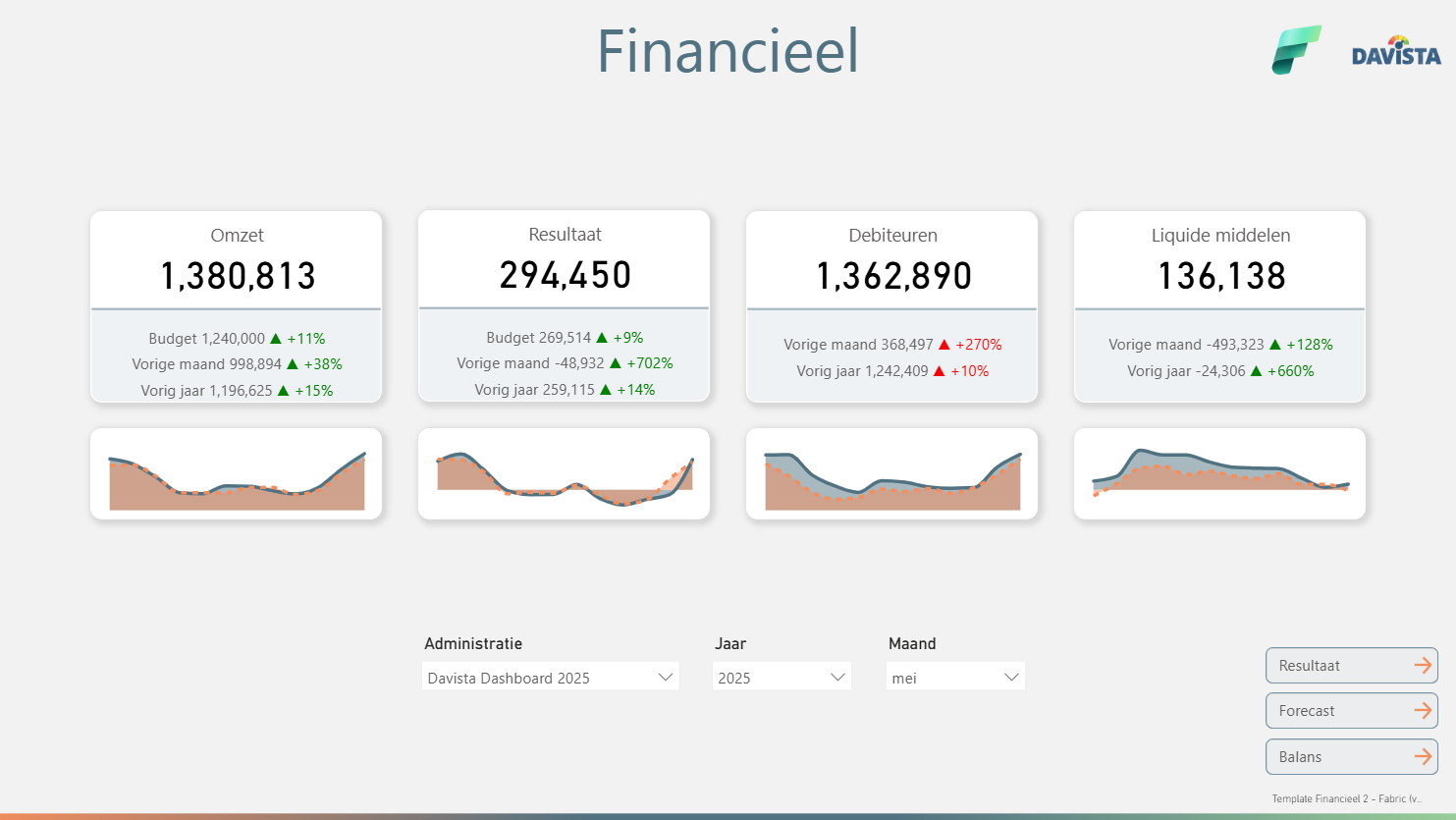 De Template Financieel 2 – Fabric is een Power BI dashboard template. Je download deze template als PBIT-bestand en koppelt het met het Fabric lakehouse. Met het SQL Endpoint van het Fabric Lakehouse kun je de data van één of meerdere administraties inlezen.